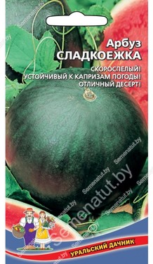 Скороспелый, надёжный, сахарный сорт. Предназначен как для выращивания под пленкой и укрывным материалом, так и для прямого посева в открытый грунт. Плоды шаровидные, тёмно-зелёные, тонкокорые. Мякоть малиново – красная, очень сочная, невероятно сладкая, зернистая, ароматная. Рекомендуется для употребления в свежем виде, приготовления цукатов и засола.