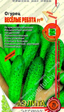 Очень ранний партенокарпический гибрид для открытого и защищенного грунта, самоопыляемый. Отличается повышенной урожайностью и долгим периодом плодоношения. Устойчив к вирусу огуречной мозаики, оливковой пятнистости, настоящей мучнистой росе, толерантен к ложной мучнистой росе. Растение среднеплетистое. Зеленец крепкий, хрустящий, ярко-зеленого цвета, крупнобугорчатый, овально-цилиндрический, масса 70-95 г, длина 7,5-9,5 см, соотношение длины к диаметру 3,1:1. Не содержит горечи. Вкусовые качества свежих и консервированных плодов отличные. Можно выращивать в домашних условиях. Компания АЭЛИТА является эксклюзивным продавцом гибрида огурца «Весёлые ребята F1»® на рынке семян.